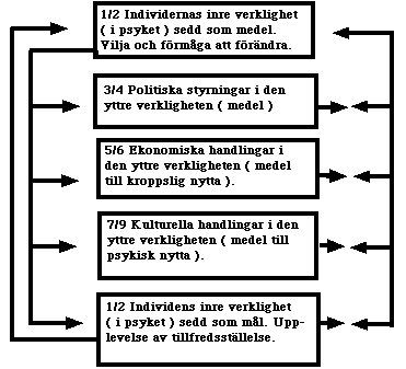 These fields contain means, but 1-2, and only 1-2, contains a final goal. The four fields have influence on each other and directly or indirectly on the final goal: satisfaction for the individual.